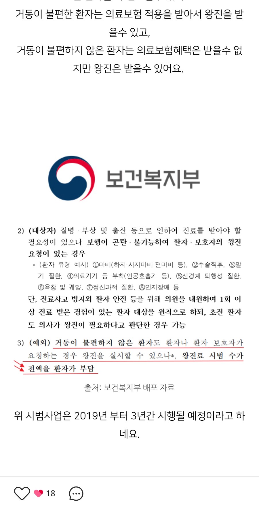 정말정말 예외인 상황에만 가능하다고 알고있는게 대부분 잘못 알고있는거임. 현행 의료법상 환자가 요청하면 누구나 가능함. 응급환자나 거동불가환자 같은 예외 상황만 가능한게 아니라, 누구나 가능함. 단지 실제로 신청하는 경우가 극히 드물어서 착각하는거. | 25.12.18 08:28 | | |