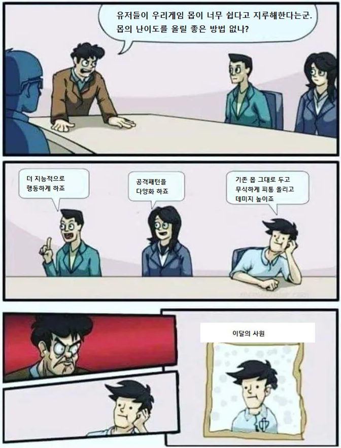 현실적으로 난이도 올리는게 쉽지 않다는건 알지만, 피통늘리는건 참 재미없어. 적 패턴 파훼해서 농락플레이하는게 재미있는건데.