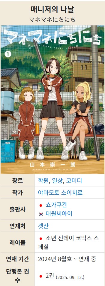 여고생 야구부 매니저들 코미디 일상물 야구부 남자 부원들과 약간 썸씽이 있긴 한데 러브 로맨스인가는 미묘한 그 정도...? 작가가 여고생 백합물을 자주 그렸어서 약간 백합 느낌도 있는데 백합물인가는 미묘한 그 정도... | 25.12.20 15:48 | | |