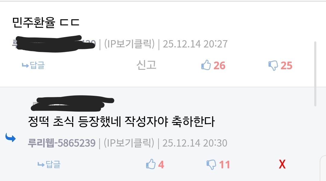 하다하다 환율도 정떡 묻히려고 하네 북유게민이면 걍 북유게에서 놀아 괜히 남유게에서 정떡 묻히려 하지 말고 | 25.12.22 23:11 | | |