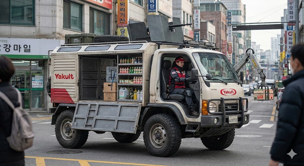 야쿠르트 카트가 약탈당하자 일부 군용 장비를 수용한 미래의 야쿠르트 카트의 상상도