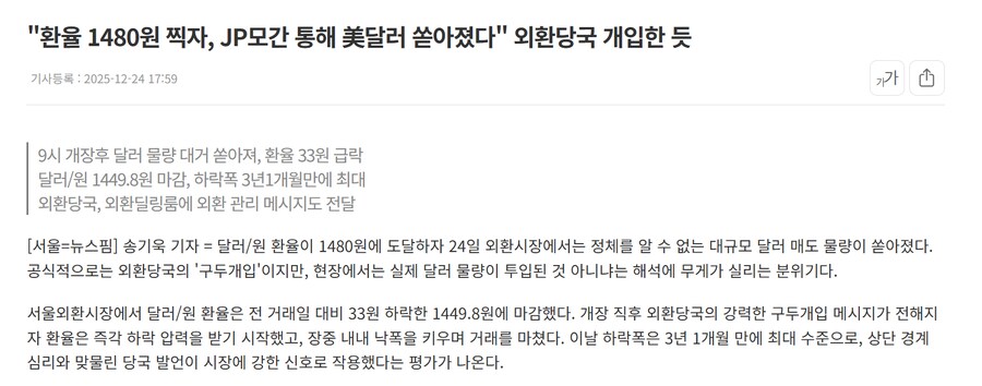 인위적인 시장개입이니 미국이 싫어할줄 알았지. 어차피 대내외적인 여건이 바뀐것도 아닌데 저런 인위적인 개입으로 얼마나 대세를 바꿀 수 있을진 모르겠네. | 25.12.24 18:46 | | |