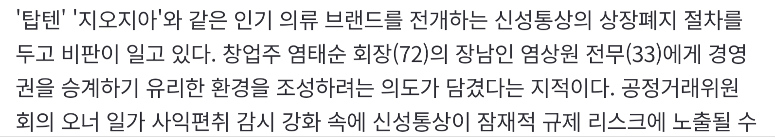 대충 기억나서 댓글 쓰니 위에 사람이 자세히 설명해줬네 어쨌건 최종적으로 법적인 문제는 없었음 하지만 최초에 눈에 보일 정도의 너무 양아치같은 시도가 문제였지 그리고 국장이 너무 부양이 안되서 주가가 낮은 것도 문제였고... 상속때문에 일부러 그랬는지까진 난 잘 모르겠음 아마 저게 꽤나 논란이 되서 법령개정의 트리거가 될수도 있을거임 실제로 기사나 이런데서도 비판을 많이 하던데 한번 읽어보면 도움될거임 https://www.ibtomato.com/Mobile/mView.aspx?no=16205&type=1 | 25.12.28 08:13 | | |