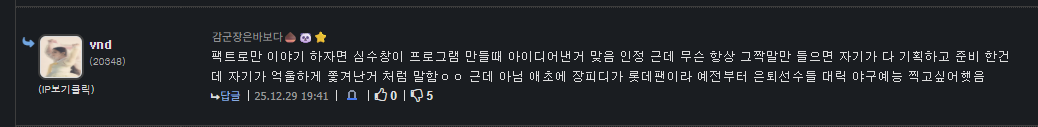 그리고 왜 뜬금없이 심수창의 하차이유를 주장하는 거임? 대체 그게 뭔 상관이 있음? | 25.12.29 20:15 | | |