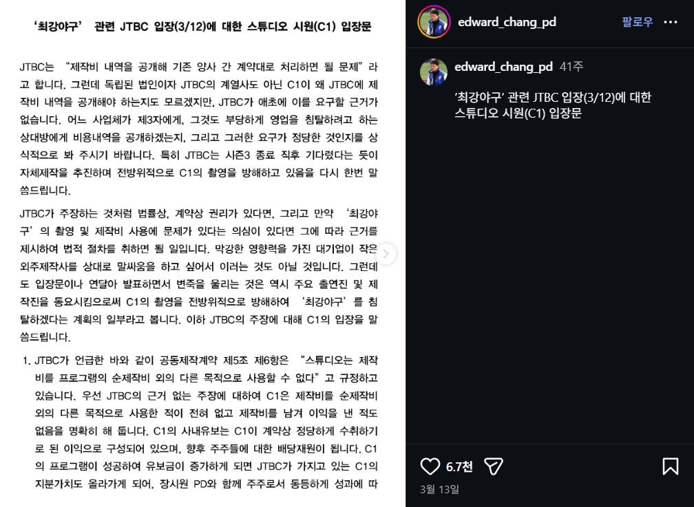 그럼 제작비 과다청구된 거 같다고 JTBC가 회계내역 공개 청구하니까 C1 이 무시 했다 라는 거도 일방적인 주장이라고 할 거임? | 25.12.29 20:03 | | |