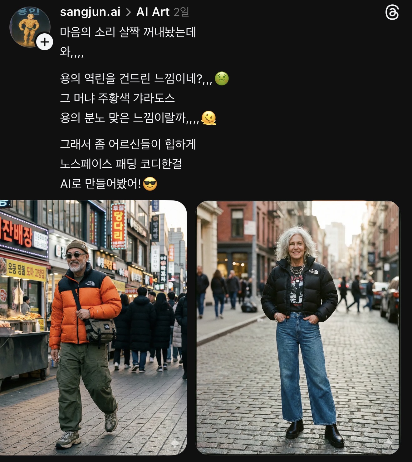 60대 어머님이 노스패딩을 입고 걸어가신다 정상인 - "아따 따숩것다, 나도 이제 패딩 꺼내야겠네, 별생각없음" 비정상 - "쓰레드에 올려서 같이 욕할사람 구해야겠다" | 25.12.30 09:34 | | |