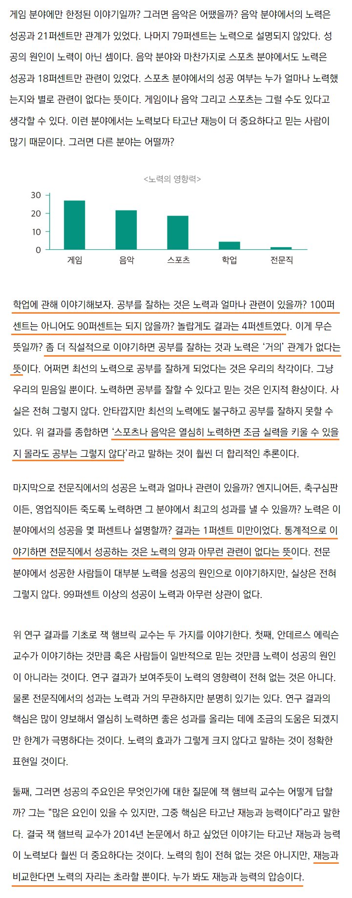 꼰대들의 노력만능주의가 수백년간 지배해온 나라라 그렇지 외국에선 십수년전에 이미 학업 성적에 미치는 영향 노력 4% 재능 96% 전문직으로 성공하는데 영향 노력 1% 재능 99% 라고 정리 내린....