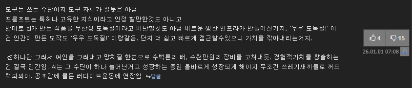 도구의 잘못은 아닌데 쓰는 사람 잘못은 맞음 칼로 요리를 하라고 그랬지 사람을 찌르라고 했음? 잘못을 했으면 당연히 처벌을 받아야지 저 글에서 무한정 도둑질은 당연히 비난받아야됨 그렇게 쓰라고 만든게 아닌데 그렇게 썼으면 혼나는게 당연하지 뭔 저런 논리로 도구에는 잘못이 없으니 쓴사람도 잘못 없음 이딴 헛소리를 당연하게 말하는 사람이 AI혐오를 부추기는 거지 그리고 그 부분이 논의가 적었으니 사회적 합의를 통해 선을 긋는 단계가 지금 필요한거고 | 26.01.02 08:58 | | |