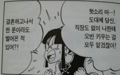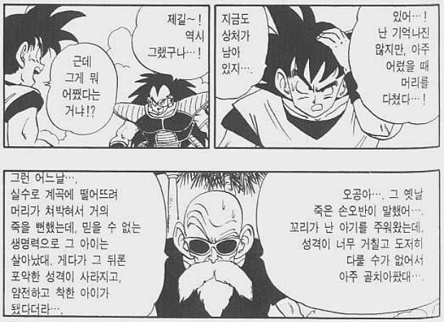 일단 손씨 일가의 가업은 농삿일... 인데 슈퍼 이전에는 손오공이 집안일 돕는 묘사가 없으니까 마인 부우편 초반에 손오반 학교 다니는 부분처럼 농사짓는 일상편이라도 한두화 끼어넣었다면 좋은 설정보충이 되었겠지만 과거 회상도 말풍선 두개로 끝내시는 조산명님은 그런 거 안하셨고..