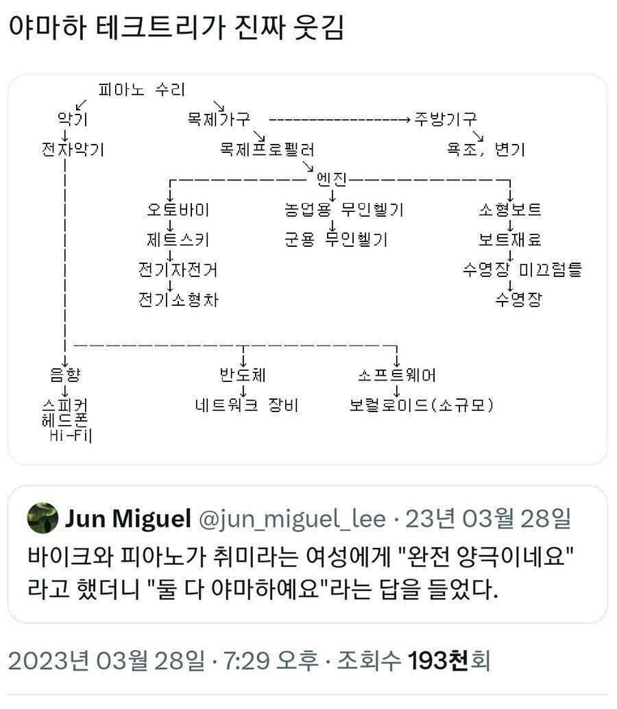 야마하 모터스 말고 야마하는 근본이 목제 악기쪽이라 '나무로 뭐 만들다보니 짬바가 생겼는데' 하고는 사업확장한거라 하려면 할 수는 있긴 할텐데 ㅋㅋㅋㅋㅋㅋ | 26.01.02 23:48 | | |
