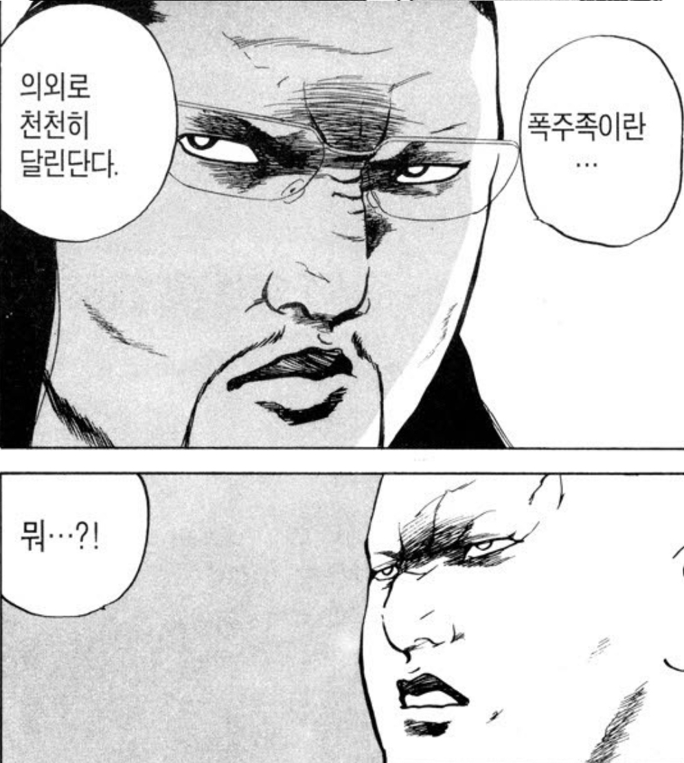 의외의 사실은 이 그림의 폭주족은 헬맷을 썻다 폭주족중엔 그나마 사람인 녀석이란 뜻이다