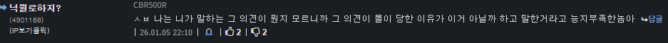 ㅈ털려서 반박 못하시니까 "너 누구 세컨이지?" 어휴 시1발 | 26.01.05 23:30 | | |