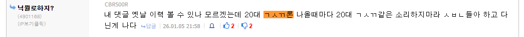 내 댓글 옛날 이력 볼 수 있나 모르겠는데 20대 ㄱㅅㄲ론 나올때마다 20대 ㄱㅅㄲ같은 소리하지마라 ㅅㅂㄴ들아 하고 다닌게 나다 | 26.01.05 21:58 | | |