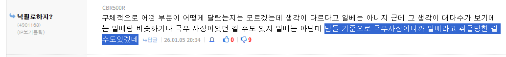 이것봐봐 생각이 다르다고 일베는 아니라면서 결국 '니들 가치관이 극우니까 일베 취급받지'로 끝나잖아 | 26.01.05 20:40 | | |