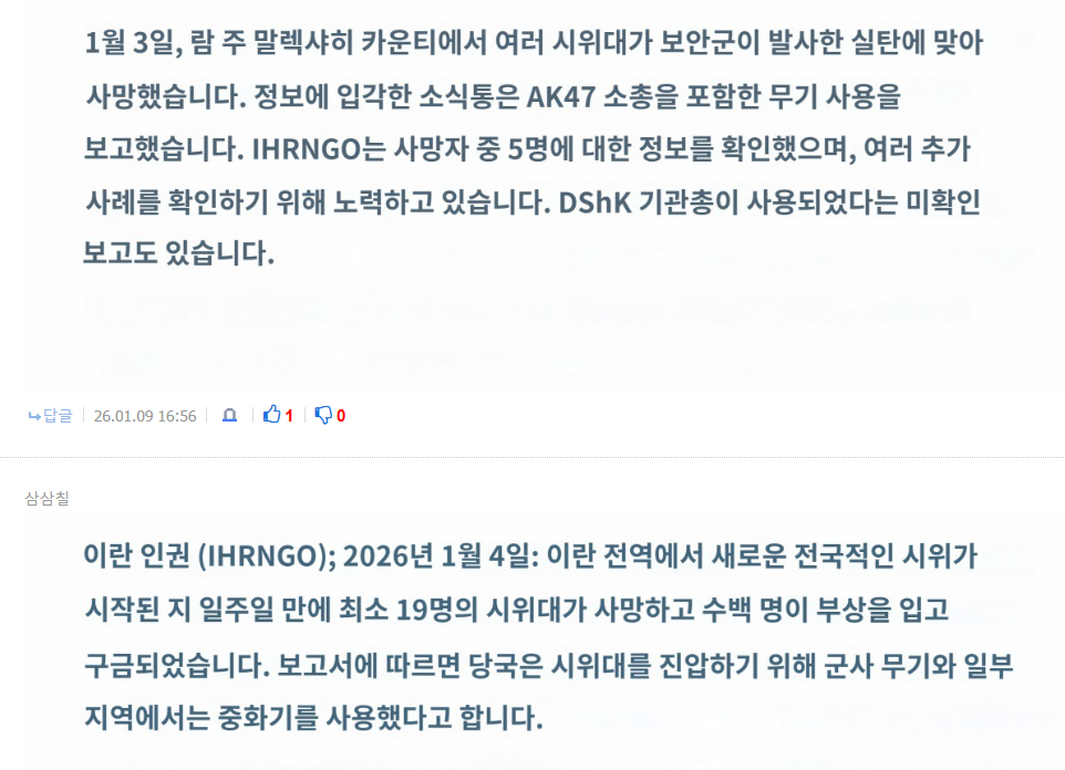시위대가 장갑차 들이받고 민중에다가 기관총 갈겼다더라고. | 26.01.09 17:10 | | |