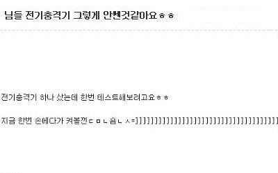 셀프는 아니고 내가 가지고있던 중국제 전기 충격기 전류 살짝 튀어서 맛만 봤는데 그냥 근육이 자유를 찾아 떠나니까 일부러 하지는 마세요. 별로 즐거운 경험은 아님. 심장에도 나쁘고.