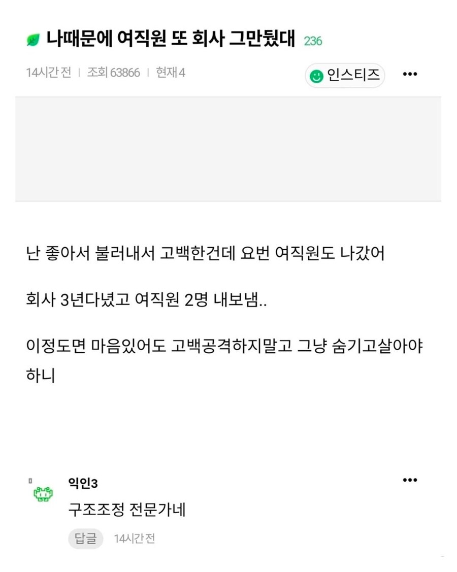 진지빨면 직장에서 고백공격하다가 직장내괴롭힘 신고당하면 자기가 구조조정당하는 수가 있음 | 26.01.11 14:26 | | |