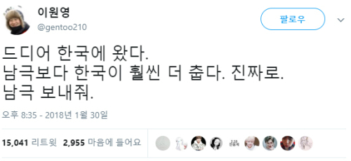 저 트윗 시기는 진짜로 한국이 더 추웠음 | 26.01.12 14:21 | | |