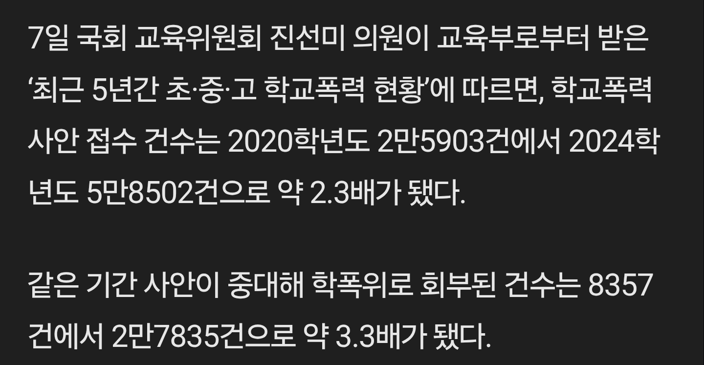 요즘 작은 일도 학폭 신고 가는 일은 흔한데 학폭 조치는 꽤 드뭄 애초에 신고 중 인정 비율이 5프로임 | 26.01.12 15:38 | | |