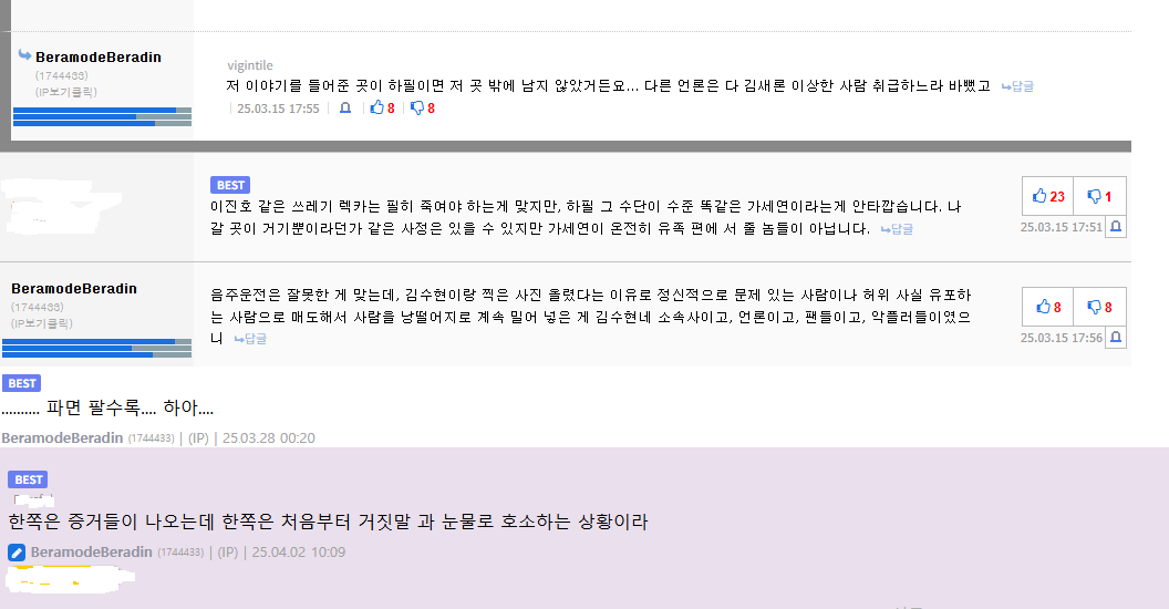 여기도 비추 다는거 보이는데 이러면서 무슨 중립적 의도로 글을 쓴다고. 의도 가지고 글 쓰고 댓글에 추, 비추 주고 그러는거 모르는줄 아닙까. | 26.01.13 09:38 | | |