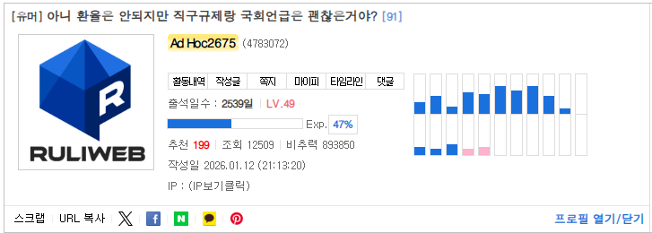 얘 환율글마다 댓글 수십개씩 달던데 이정도면 얘가 누구보다 환율글을 좋아하는거 아님? | 26.01.13 09:23 | | |