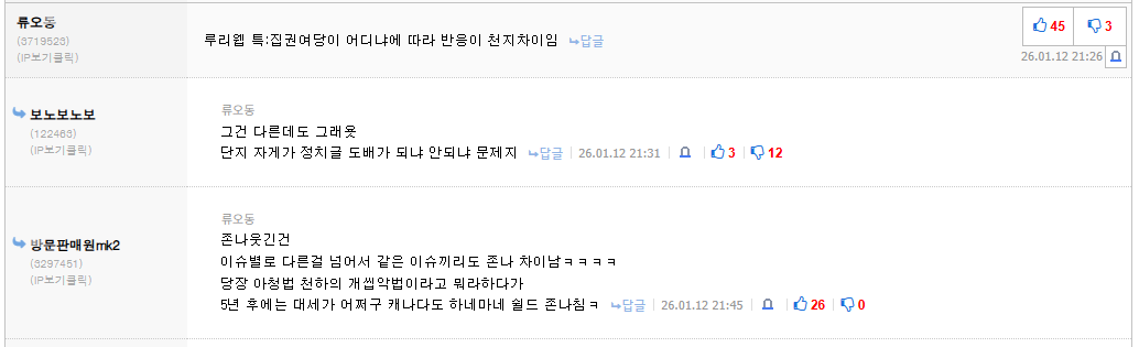 댓글에서 좌우따지고 있으니까 정떡소리 나오지 그러면 뭣떔에 나온다고 생각하는거임? | 26.01.13 09:21 | | |