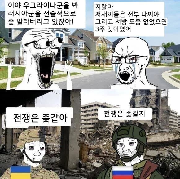 우리나라로 치면 대한민국이 망해서 헤체되는대 다른정체성을 확립한 강원도가 우린다르다! 하고 독립함 그러면서 행정편의상 들어가있던 경상북도 일부 땅까지 가지고 독립함 30년후 그 땅 소유권 가지고 다시 강해진 신한국이 다른국가가 되버린 강원도를 침략하는 거임 역사적 배경이 존나개 꼬여 있고 러시아가 ㅁㅊㄴ인건 맞지만 완전한 타국 침략과는 배경이 다름 | 26.01.14 19:32 | | |
