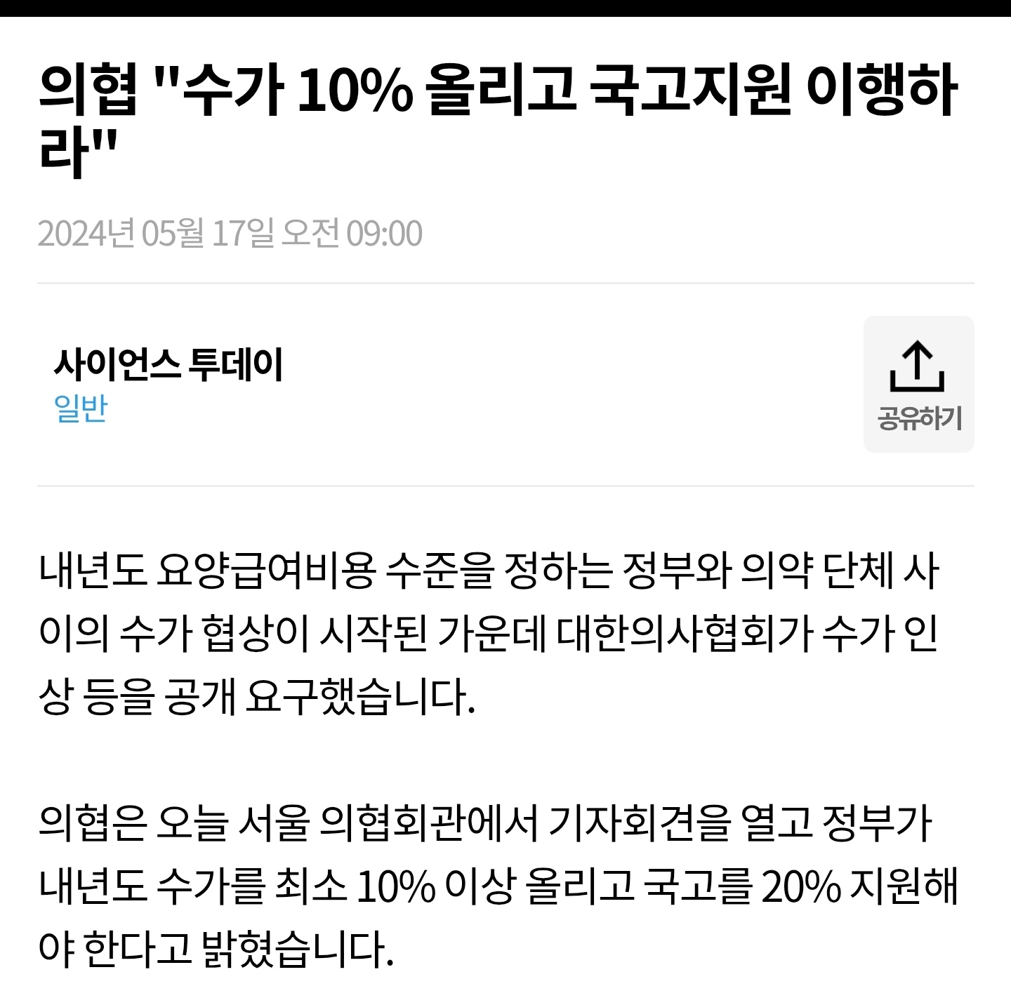 그리고 혹시나 해서 말하지만 수가는 건정심에서 결정하고 건정심 구성 25명중 의사는 2명임. 명확한 제시를 안한다고? 요구사항 하고있음. 물론 요구사항대로 된 적 한번도 없어서 정부측 계산으로도 원가보전율이 90%가 안됨. 상대가치평가에 대한 비판이라면 모를까 의협이 명확한 제시 안한다는건 틀림. | 26.01.15 17:04 | | |