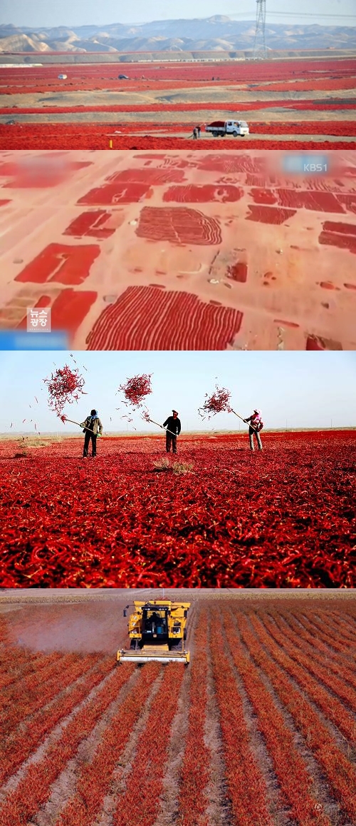 중꿔의 고추밭. 지평선이 보이는 고추밭. 수확후 빈땅에 그대로 펼쳐놓고 가끔 뒤집어주는 100% 태양초. 여담으로, 중꿔 고추가 울나라것에 비해 색이 좀 거무스르한것은, 짤처럼 기계로 수확하려면 고추 잎이 다 떨어지고 해야해서 수확 시기가 울나라에비해 많이 늦다고 한다. 그래서 그 동안에 색이 어두워지는거라고 함.