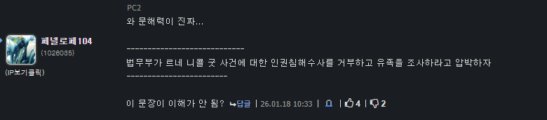 와 문해력이 진짜... ---------------------------- 법무부가 르네 니콜 굿 사건에 대한 인권침해수사를 거부하고 유족을 조사하라고 압박하자 ------------------------ 이 문장이 이해가 안 됨? | 26.01.18 10:33 | | |