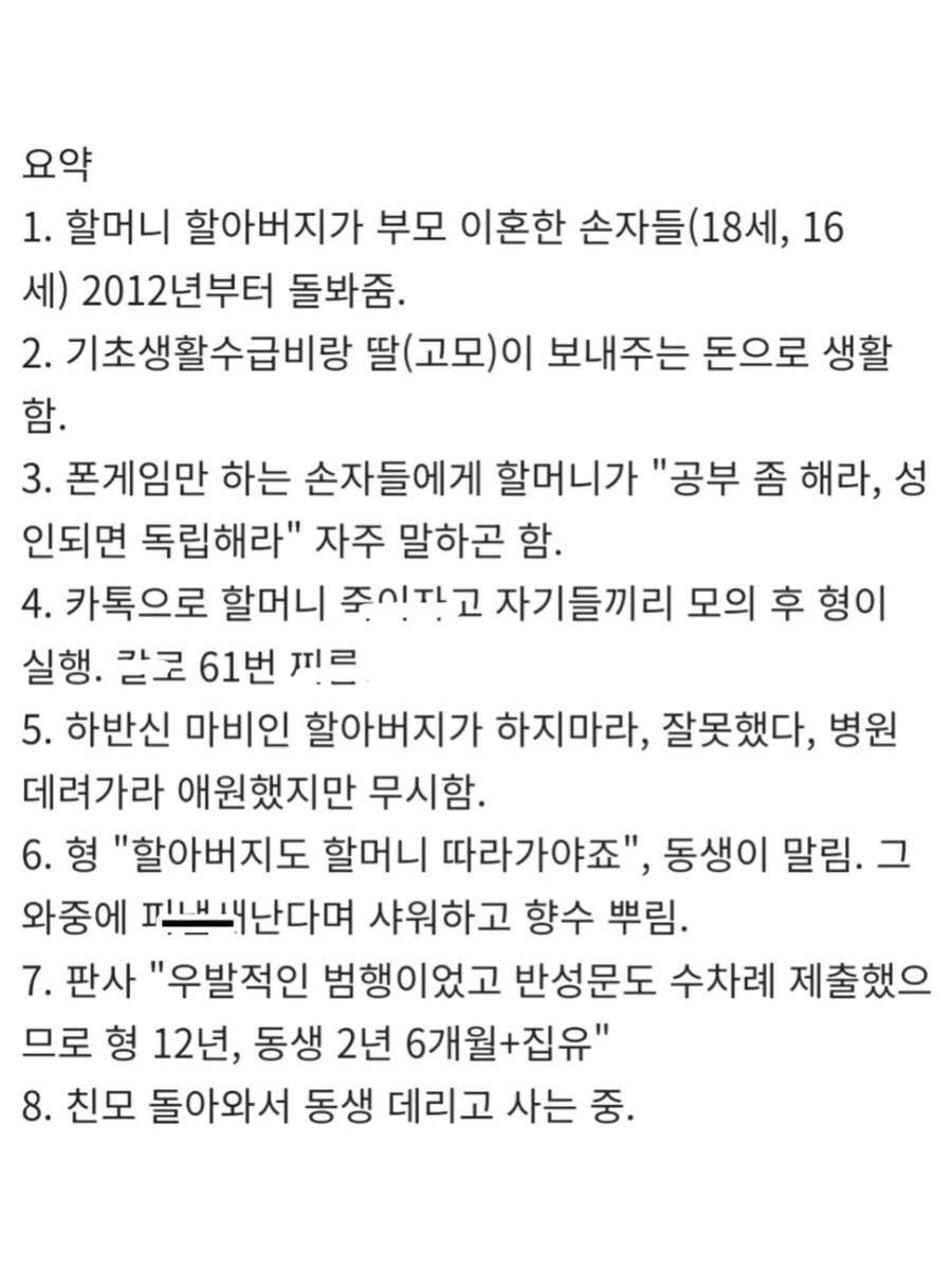 ㅇㅇ거기다 할아버지가 제발 그러지말라고 잘못했다고 병원 좀 데려가달라하는데 61번 칼질하고서는 샤워함 백만배는 더 심한 놈들임 | 26.01.18 21:21 | | |