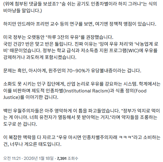 아니 근데 아시안도 먹기 좋게 살균과 후처리 잘 하면 결국 백인 입장에서도 먹기 좋아지는 거 아닌가. 유당불내증 있는 백인은 뭐 백인 탈락이란 말인가? | 26.01.18 18:47 | | |