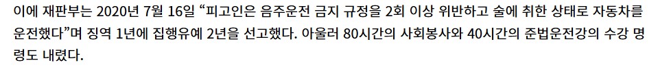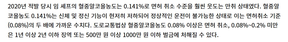 당시 혈중알콜농도 0.141%로 면허 취소 기준 0.08%를 초과한 상태여서 그럴거임. 저 상태에서 운전하면 1년 이상 2년 이하의 징역이나 500만원 이상 1천만원 이하의 벌금의 처벌이 있다나보더라고. | 26.01.19 10:54 | | |