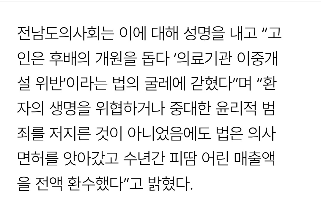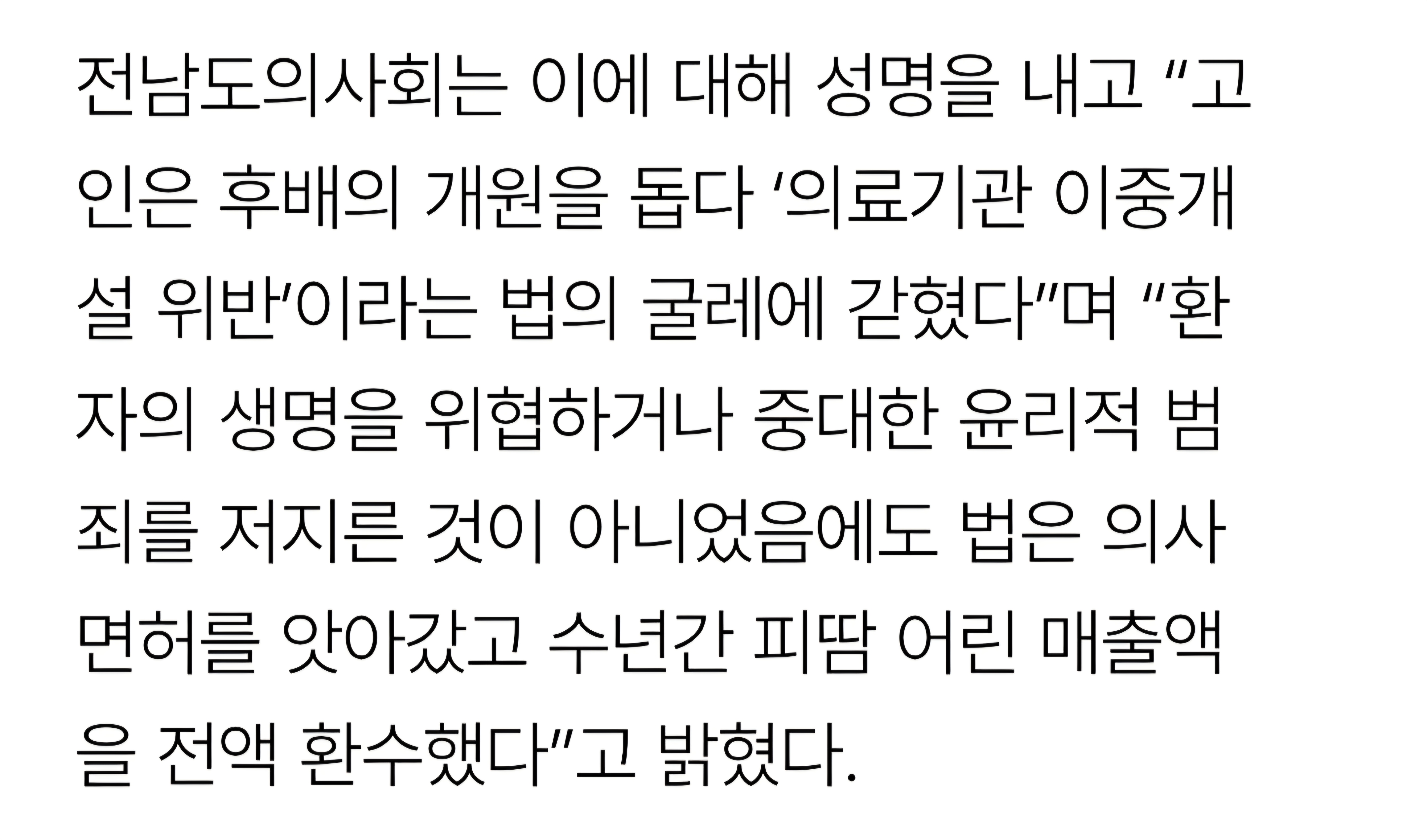 “고인은 후배의 개원을 돕다 ‘의료기관 이중개설 위반’이라는 법의 굴레에 갇혔다”며 “환자의 생명을 위협하거나 중대한 윤리적 범죄를 저지른 것이 아니었음에도 법은 의사 면허를 앗아갔고 수년간 피땀 어린 매출액을 전액 환수했다” 엥 기사보니까 잇는디 | 26.01.20 19:09 | | |