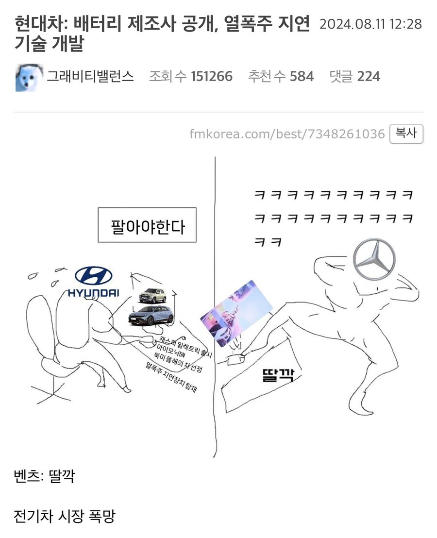 이거 맞는 말인데 어이가 없네ㅋㅋㅋㅋ이미 몇몇 대형유튜브에서도 다뤘는데 지금 전기차에 올인해갖고 얼마전에 출시한 차도 부품 없어서 수리못하는 사례들이 몇년전부터 꾸준히 속출함 yf같이 옛날에 나온거야 부품 돌려쓰기라도 한다지만 애매하게 나온 애들은 돈을 줘도 부품 없어서 못 고치는 차들 있음 외제차는 돈을 주면 부품을 구할수라도 있는데 일부 현기차는 돈 주고도 부품 못구하는 차들이 있음 현기가 정비가 빠르다는것도 마냥 사실이 아닌데 | 26.01.21 10:59 | | |