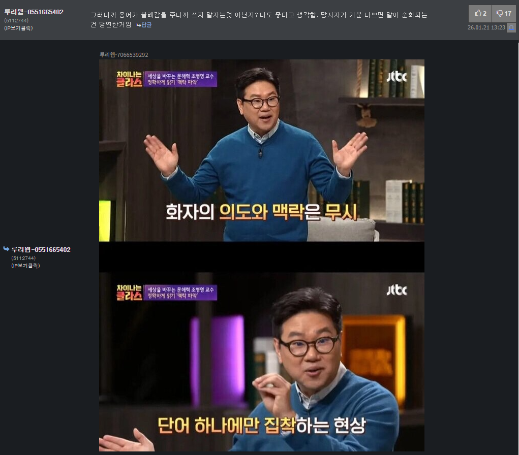 사실 일부러 저 단어 사용하는게 눈에 보이니까 사람들이 더 불타지 | 26.01.21 13:41 | | |