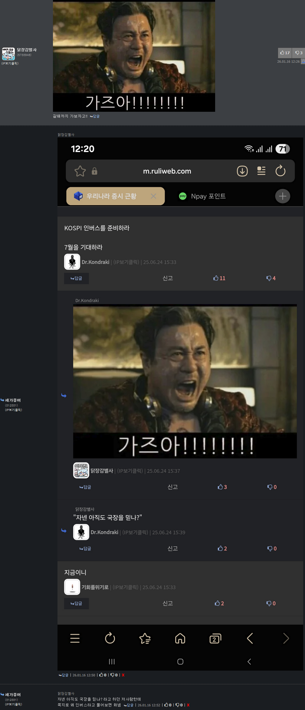 망하라고 고사지내면서 정치채널 따봉 다 누르고 다니던 누군가는 자신이 누른 개추버튼이 하등 쓸모없는걸 깨닫기 싫어서 배알이 꼴리는 것ㅋㅋㅋㅋㅋ | 26.01.22 10:02 | | |