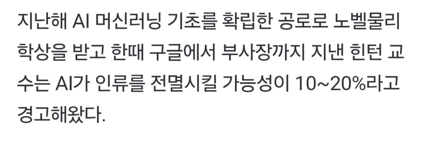 그 뭐더라? 갓 오브 워에 나온 어떤 북유럽 신의 어머니도 자기 아들 죽는거 막을려고 아예 마법으로 자기 아들을 불로불사로 만드는대신에 아무것도 감각을 아예 못 느끼게 만들던데 ai도 인류가 아들되면 걍 무조건 보호하기 위해서 먼저 신체를 절단해서 보호한다든가(머리만 절단해서 생명 유지장치에 영원히 연결한다든가....) 그냥 무조건적인 효율 우선식으로 할거 같은데..... | 26.01.22 17:29 | | |