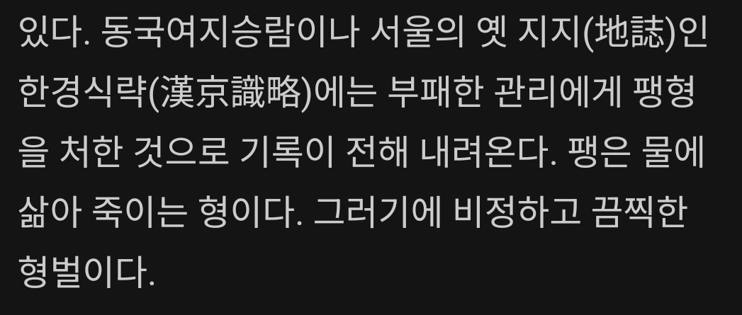 동국여지승람이나 한경식략에 언급된 팽형은 실제 삶아죽였다 기록되어 있다고 함. 다만 조선왕조실록에는 기록이 없음. | 26.01.23 04:03 | | |