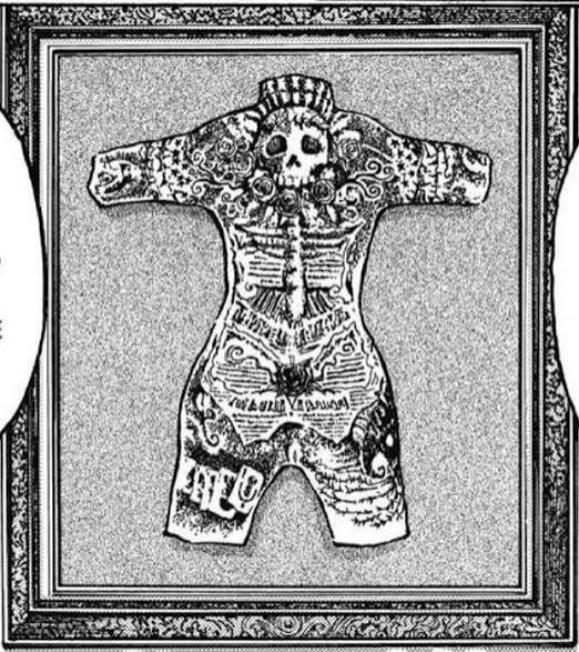 후쿠시 교수의 문신 집착의 첫이유는 피부 잉크가 매독을 죽일 가능성을 발견한 것에서 시작이었음 즉 시작은 진짜 학술적 관심과 선의 문제는 후쿠시가 평생 모은 인간 가죽은 2천명이며, 다 각기다른 문신과 가죽이 후쿠시의 자택과 연구소 안쪽 개인방에 넘쳐났고, 그중에 피부 전체를 문신으로 가린 피부는 기념으로 삼아 자기 거실에 전시까지 해놨다 전시 해노은 시점에서 후쿠시 교수가 처음 매독을 잡으려고 시작했던 문신에 대한 관심은 이미 다른걸로 변질되어 있었다