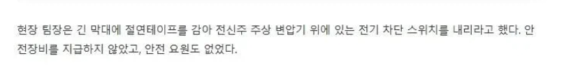 노동인권 후진국임? 인도 수준도 아니면서 전기라는 위험한 걸 다루는 일에 안전장비 지급도 안 해줬네?