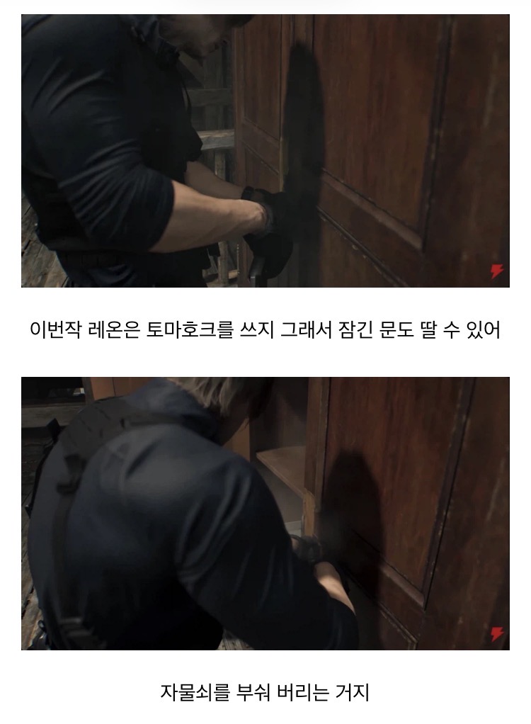 이번작 레온은 토마호크를 쓰지 그래서 잠긴 문도 딸 수 있어