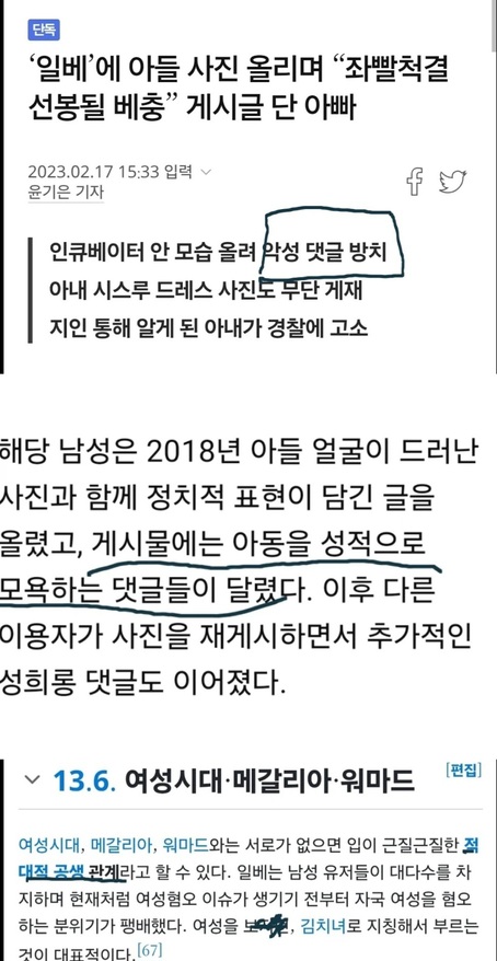 https://www.khan.co.kr/article/202302171533001#ENT 아기 상대로 악플다는 여시범죄자들 보고 생각나서 올려보는 일베범죄자들 과거 일베에서도 아기아빠가 좌빨척결 제목으로 지 아들 사진 올려서 베 충 이들의 악플들을 방치해서 논란된 적 있음. 일베에 아들 사진 올리는 아빠도 어이없는데 더 어이없던 건 여초와 페미집단에 맞서 남성인권 수호를 주장하면서 남자아기에 신나게 악플달던 베 충 이들;;;;;; 일베가 남초판 여시, 여시가 여초판 일베 그냥 하는 말이 아님 (아까 전에 게시물로 올렸었는데 내가 생각해도 게시물로 올릴 정도는 아니 보여서 여시 비판하는 게시물에 댓글로 답니다.)