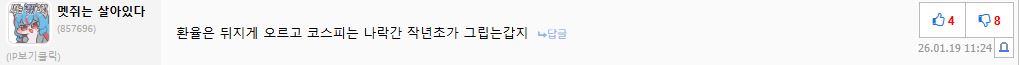 당장 국장 한참 오를때 유게에서 국장 이제는 할만 하다고 하니까 조롱에 국장 탈출은 지능순이라는 소리 들었는데 그 사람들 다 특정 성향이라서 그런건가? | 26.01.28 10:15 | | |