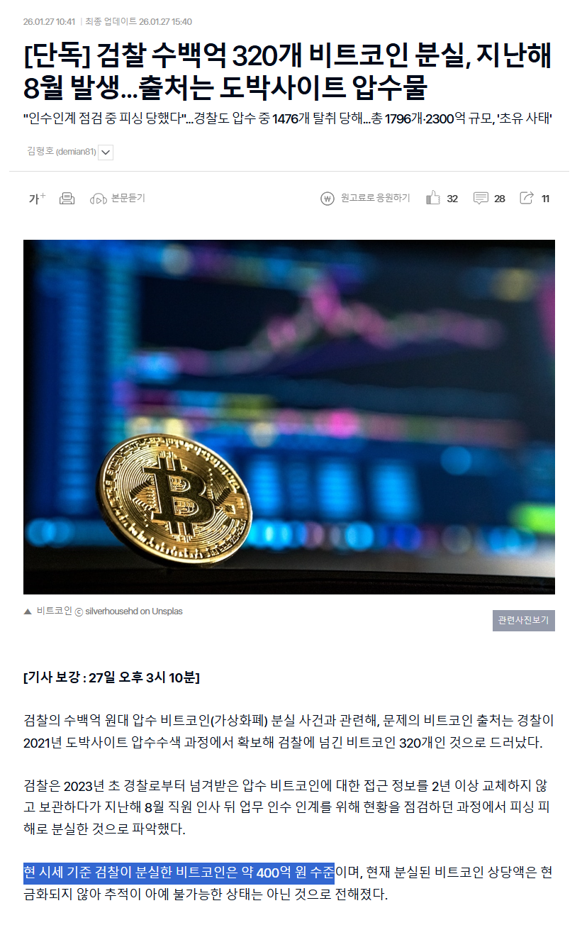 https://www.digitalasset.works/news/articleView.html?idxno=31318 [단독] '검찰 분실' 320.88BTC 지갑 발견...이체·세탁 정황 없어 찾긴했음 | 26.01.28 16:22 | | |