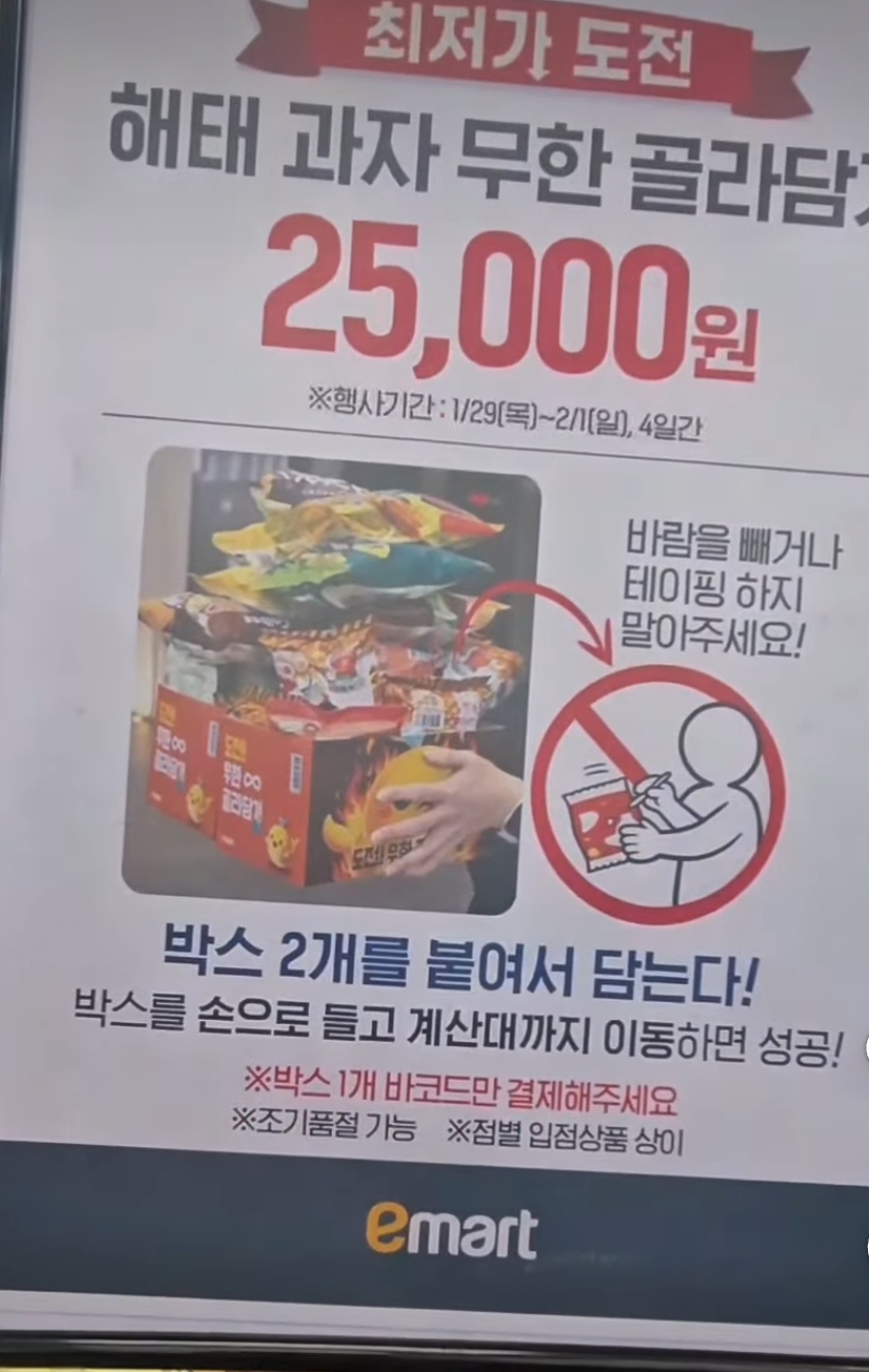 이마트에서 하는 이벤트인데 테이핑으로 했으면 캐셔가 계산할때 단번에 눈치채고 계산 취소시키겠지 그럼 개쌍욕쳐먹고 빠꾸쳐먹을텐데 그걸 굳이 sns에 올리겠냐.. 왜케 위에들 다 꼬여있음
