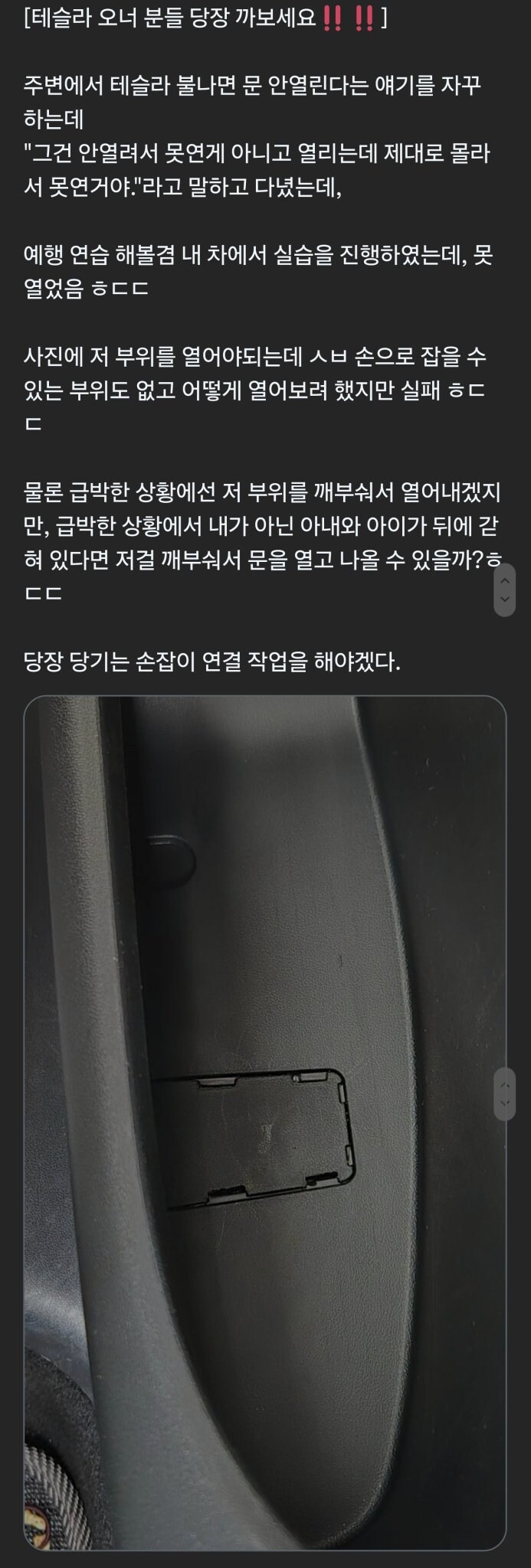 저건 맞지. 테슬라가 시작하니 다들 비슷하게 만들면서 화재 났을 때 문 안열려서 참사 자주나던.