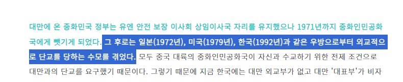 요거는 사실 전달을 위해 조금 설명이필요함. 우리나라가 단교를 하려고 했는데 일부러 먼저 안하고 소문을 냈음. 단교 당하는것보다 대만이 먼저 단교를 하는 그림으로 대만의 마지막자존심을 지킬수있게 배려 해준거 였음. | 26.02.04 22:20 | | |