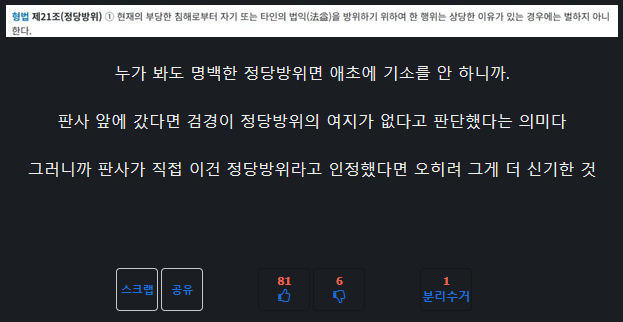 정당방위는 너 잘걸렸다 이런법이 아닐탠데 그런걸 원하는 사람이 몇몇 보임