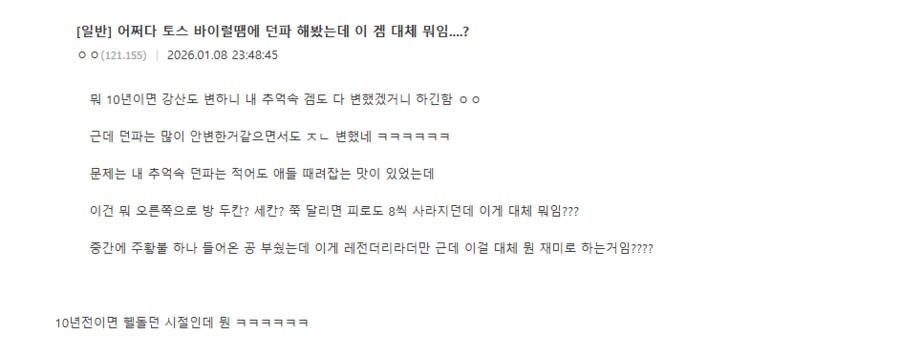 본문 내용에 따라 달라지겠지 본문에 옛날이야기 나올만한 건덕지가 없는데 갑자기 나타나서 나 옛날에 그 겜 접음 ㅅㄱ 이러고 있으면 그게 분탕이지 아님 뭐겠음 | 26.02.09 00:49 | | |